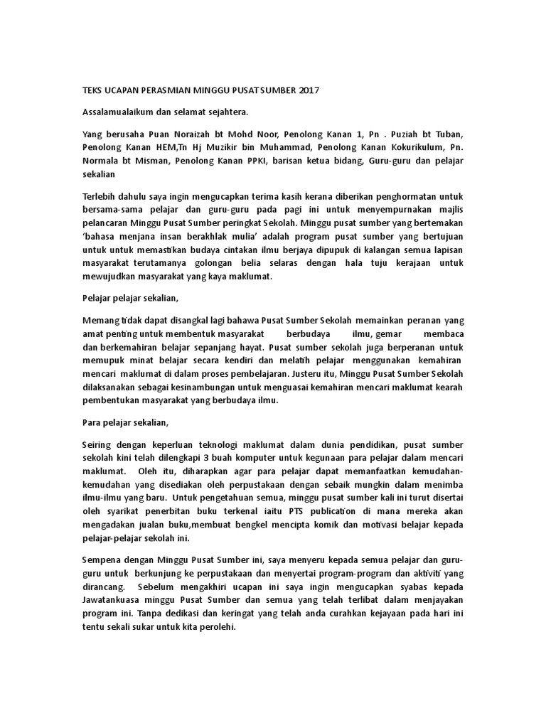 Ianya bukan sekadar satu temasya bagi mengukur kemampuan anak-anak kita bertanding dalam acara-acara sukan tetapi temasya ini juga membina keyakinan diri serta suntikan kreativiti dan inovasi dalam kalangan murid-murid. Teks Ucapan Perasmian Majlis Graduasi SEMESRA. Gkmp Bahasa Teks Ucapan Perasmi Bulan Bahasa Peringkat Sekolah.